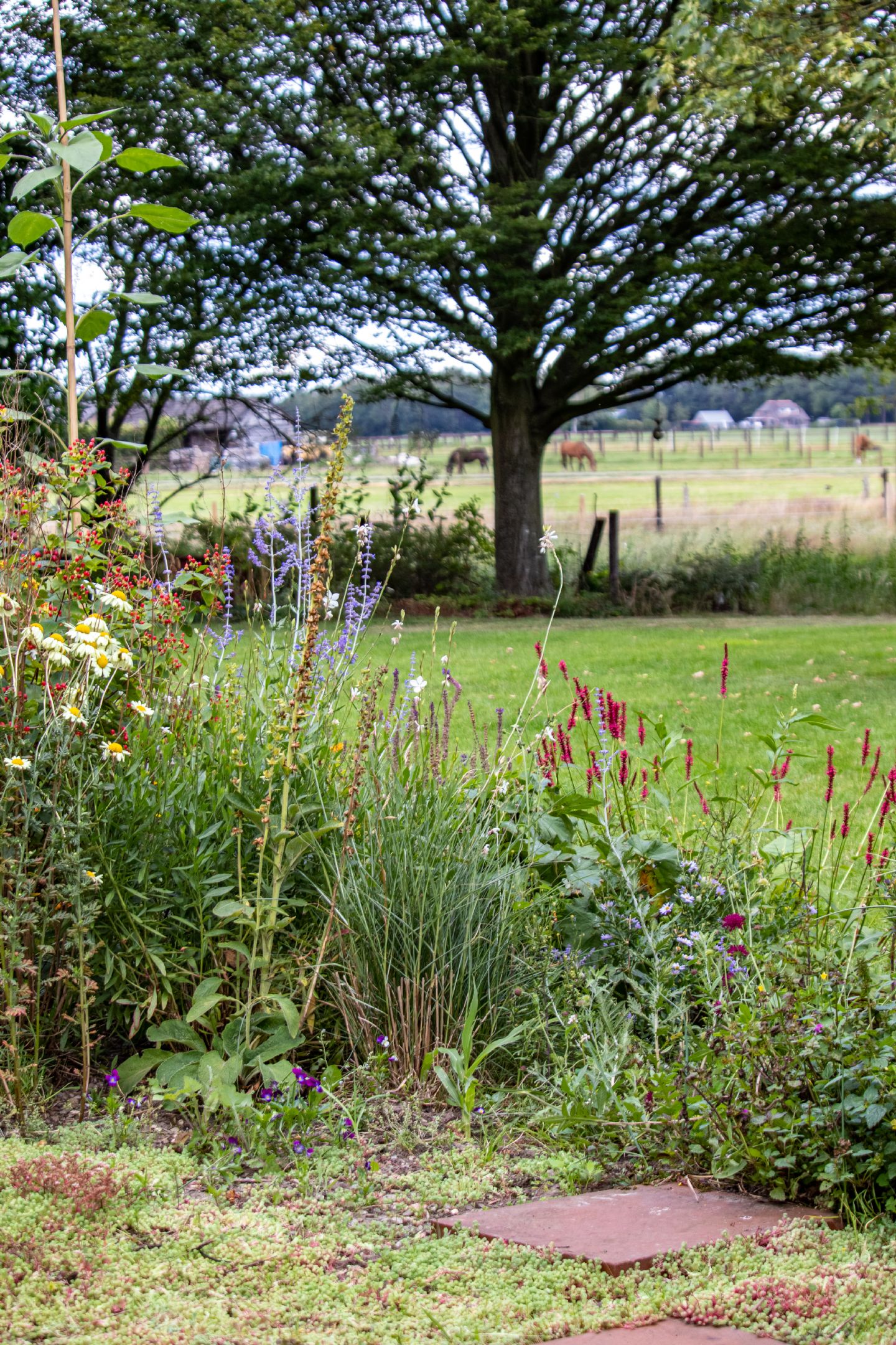 De boerderijtuin als wilde tuin met veel bloemen. Deels wilde bloemen. Deels gecultiveerde soorten. Eetbare planten, bessen en fruit. Eigenlijk is dit geen historisch verantwoord idee. Het enige wat naar boerderij verwijst is het huis en ruimte.